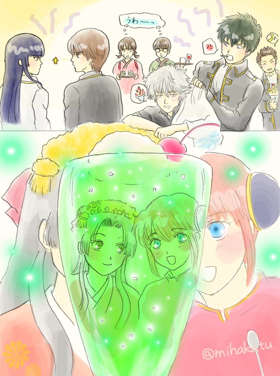 みはかつ 銀魂後祭り開催おめでとう 夜の部 少し低浮上 輝く雪の結晶ラバー Gntm Odai お題 メロンソーダ 初めてのメロンソーダに喜ぶ 神楽 ちゃん それを見て幸せな そよ姫 あと その他 雑 Ww イラスト イラスト好きな